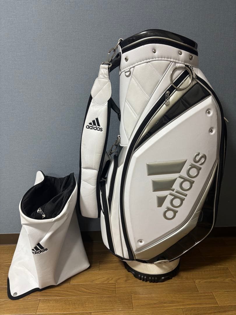 ブリヂストン キャディバッグ9型、白(ホワイト)フードカバー、ネームプレート付き※ネームプレートのみ新品(新調したバッグに付属していたもので、ビニールから一度も出していません)写真の1-2枚目はホームページから引用したもの、3枚目以降は実際の写真です2023年8月にBG-100 キャディバッグ付クラブセットを購入し、この度バッグを新調したのでキャディバッグのみ出品します年に2〜3回ラウンドで使用したもので、ラウンド以外は練習場にて使用していました多少の使用感はあると思いますが、目立つ汚れや傷はない為まだ十分お使いいただけると思います中古品にご理解の上、購入お願いいたしますフードカバーは収納した状態で送ります| カテゴリー: | スポーツ>>>ゴルフ>>>ゴルフバッグ・キャディバッグ |
