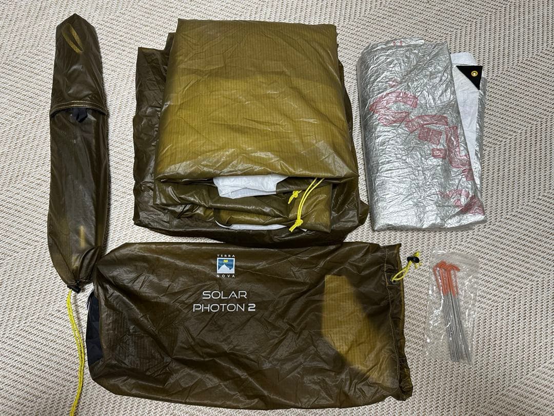 ①本体(サンド スカートなし 加工あり)② グランドシート(加工あり)③ベスタビュール(サンド スカートあり 1回使用)④インナーテント(1回使用)⑤ルーフ(1回使用)⑥ウレタン窓(未使用)①を2023年3月に購入しました。以降、①と②は年3〜4回の使用、③と④と⑤は1回の使用、⑥は未使用です。下記、ご了承の上、ご購入をお願いいたします。①と②は、虫の侵入をなるべく防ぐために写真の通り、加工しています。⑥は購入後未使用ですが、未開封のため、中の状態を把握しておりません。中古品となります。大事にしていましたが、使用に伴う汚れや傷等があります。屋外で使用しましたので、芝生等がついております。素人による出品です。見落としの可能性やわかりにくい点がありますことご容赦ください。後々のトラブルを防ぐために、ご不明な点や気になる点を解決いただいた後、ご購入をお願いします。仕事をしておりますため、連絡が遅くなることがございます。なるべく早く返信することよういたします。以上、ご了承の上、ご検討とご購入をお願いします。| カテゴリー: | アウトドア・釣り・旅行用品>>>テント・シェルター>>>キャンプテント |