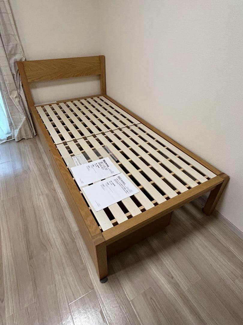 - 直ぐに届きました。 確かにネジがたくさんあって組み立ては多少面倒ですが、説明書どおりで難しいこともありませんでした。今のところ、横揺れもなく、安定感もしっかりしています。市販の薄い衣装ケースが下に入る程度のベッド高もちょうど良い感じの高さに思えます。ベッドマットでもお布団でも使えるのもありがたいです。
